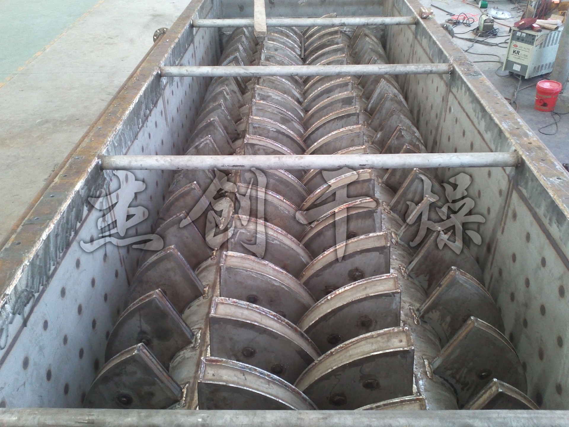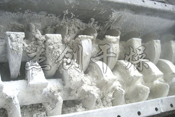 空心軸上密集排列著楔型中空漿葉,熱介質(zhì)經(jīng)空心軸流經(jīng)漿葉。單位有效容積內(nèi)傳熱面積很大,熱介質(zhì)溫度從-40℃到320℃,可以是水蒸汽,也可以是液體型:如熱水、導(dǎo)熱油等。間接傳導(dǎo)加熱,沒有攜帶空氣帶走熱量,熱量均用來加熱物料。熱量損失僅為通過器體保溫層向環(huán)境的散熱。楔型漿葉傳熱面具有自清潔功能。物料顆粒與楔型面的相對運動產(chǎn)生洗刷作用,能夠洗刷掉楔型面上附著物料,使運轉(zhuǎn)中一直保持著清潔的傳熱面。漿葉干燥機的殼體為Ω型,殼體內(nèi)一般安排二到四根空心攪拌軸。殼體有密封端蓋與上蓋,防止物料粉塵外泄而充fen發(fā)揮作用。