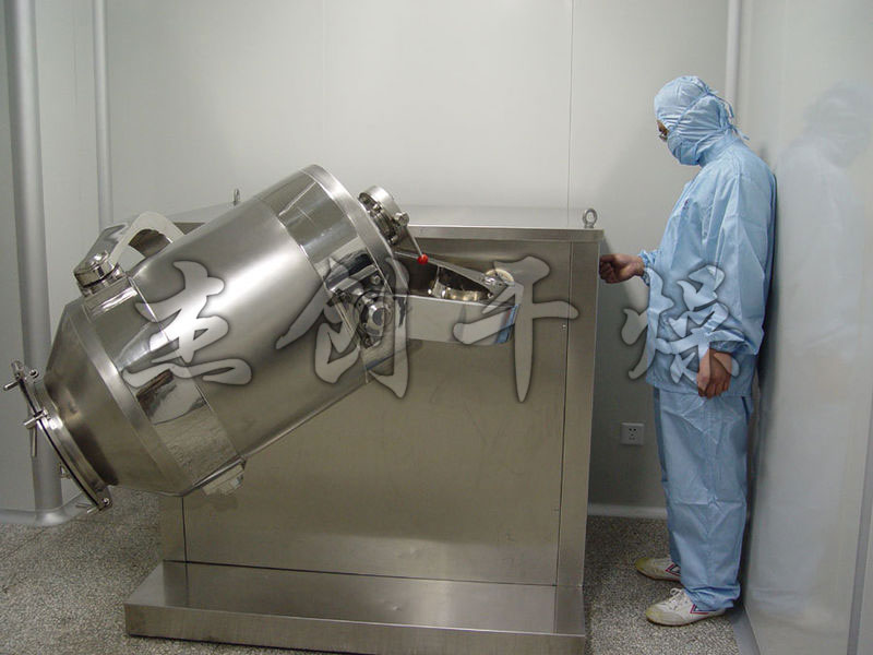 結(jié)構(gòu):該機(jī)由機(jī)座、傳動(dòng)系統(tǒng)、電器控制系統(tǒng)、多向運(yùn)動(dòng)機(jī)構(gòu)、混合筒等部件組成。與物料直接接觸的混合筒采用優(yōu)質(zhì)不銹鋼材料制造,桶體內(nèi)外壁均經(jīng)鏡面拋光。