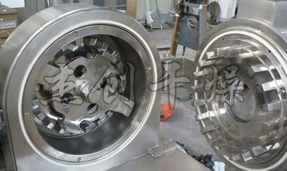 4、本機(jī)利用活動(dòng)齒盤和固定齒盤問的高速相對(duì)運(yùn)動(dòng),使被粉碎物經(jīng)齒沖擊、摩擦及物料彼此間沖擊等綜合作用獲得粉碎。