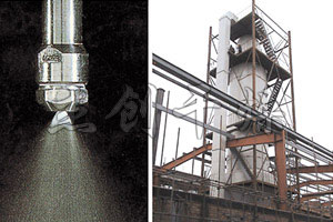 壓力噴霧干燥機工作過程為:料液通過隔膜泵高壓輸入,噴出霧狀液滴,然后同熱空氣并流下降,大部分粉粒由塔底排料口收集,廢氣及其微小粉末經(jīng)旋風(fēng)分離器分離,廢氣由抽風(fēng)機排出,粉末由設(shè)在旋風(fēng)分離器下的收粉筒收集,風(fēng)機出口處還可裝備二級除塵裝置,回收率在96%-98%。