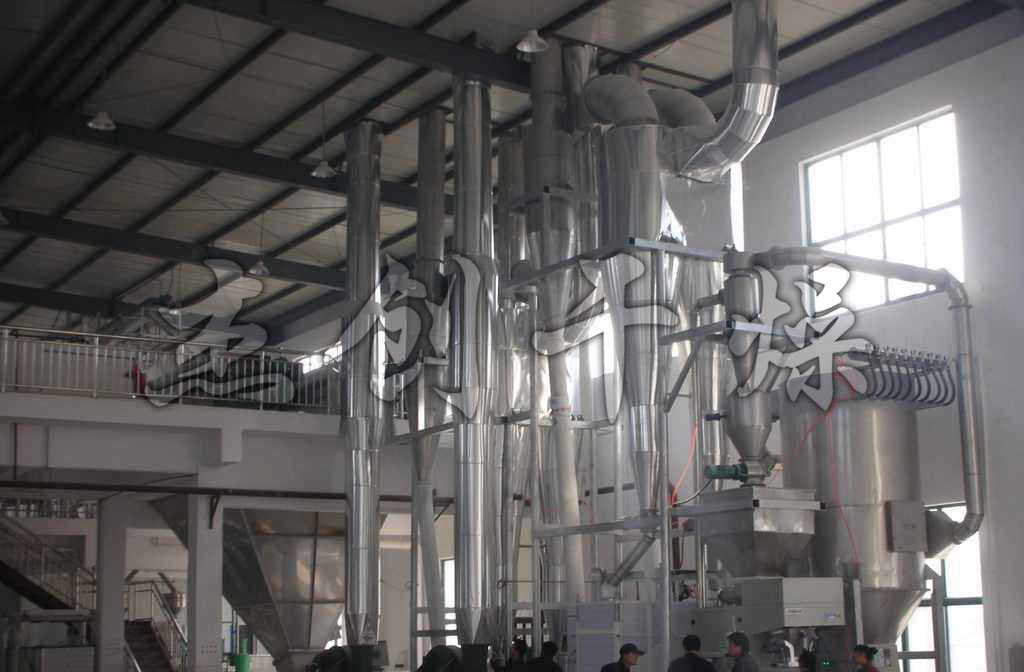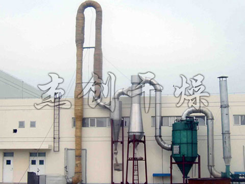 上述這類物料具有特殊性:比重輕,加料難,易燃,易爆。針對此情況,我公司技術(shù)部門開發(fā)研制的新型氣流干燥機(jī),在原氣流干燥機(jī)的基礎(chǔ)上改進(jìn)了加料形式,解決了“架橋”現(xiàn)象。創(chuàng)新改進(jìn)了旋風(fēng)分離器,解決了物料翻滾不出料的現(xiàn)象。系統(tǒng)集成,控制先進(jìn),超溫報(bào)警連鎖關(guān)閉熱源,有效解決了溫度過高引起的燃燒爆炸問題。