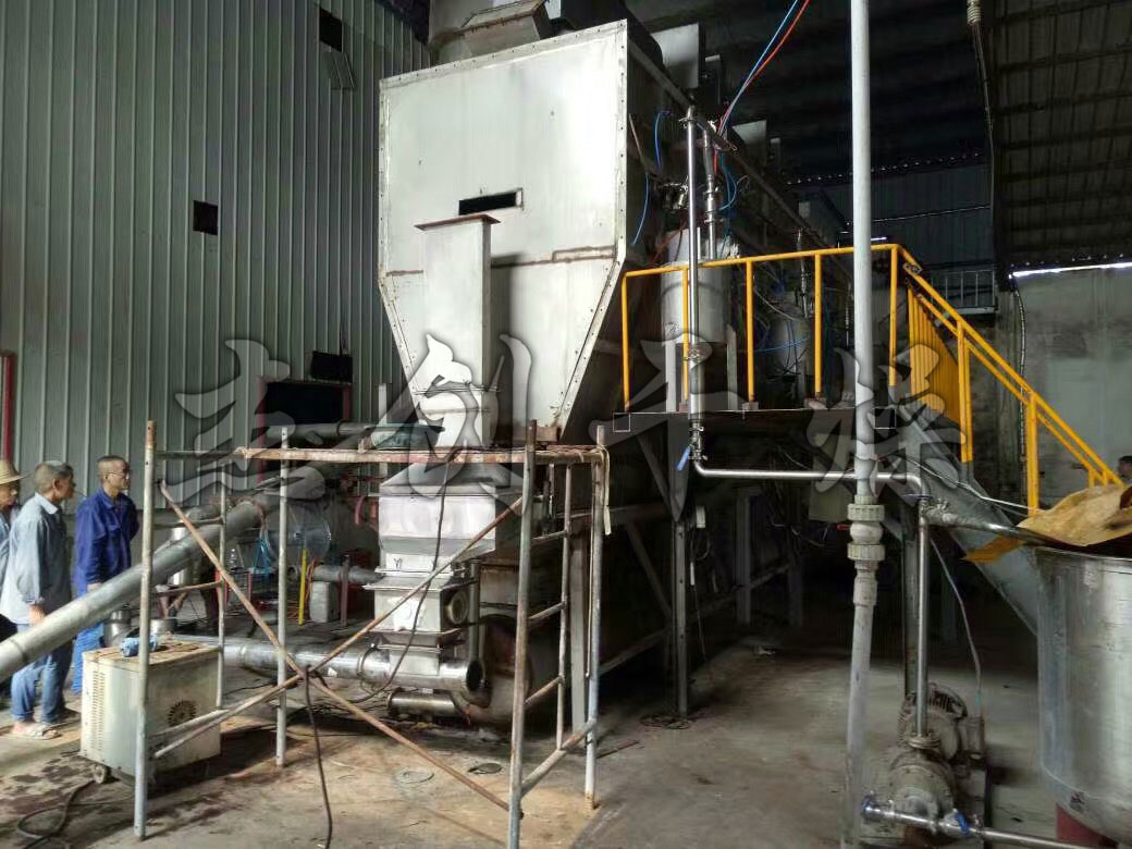 散粒狀固體物料由加料器加入流化床干燥器中,過濾后的潔凈空氣加熱后由鼓風(fēng)機(jī)送入流化床底部經(jīng)分布板與固體物料接觸,形成流態(tài)化達(dá)到氣固的熱質(zhì)交換。物料干燥后由排料口排出,廢氣由沸騰床頂部排出經(jīng)旋風(fēng)除塵器組和布袋除塵器回收固體粉料后排空。